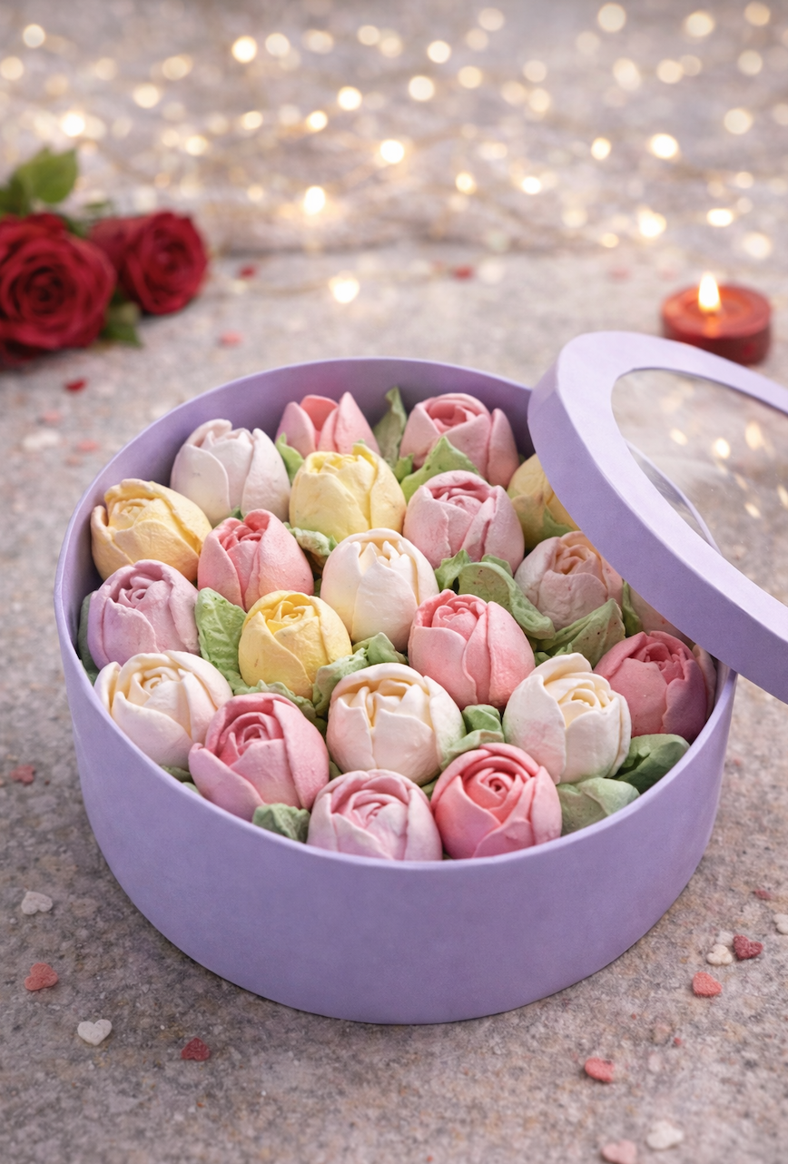 Ніжна композиція з зефірних тюльпанів, оформлена у стильній коробці у формі серця з червоним бантом — ідеальний подарунок, який дарує емоції з першого погляду 💖